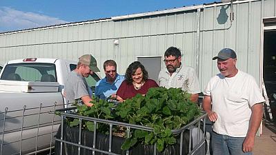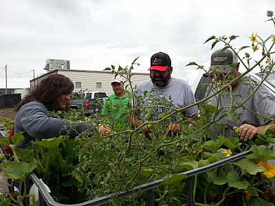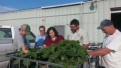 The District Manager and the Board of Supervisors, look over one of the self watering totes planted for 2014. Planted in this tote are, pumpkins, cucumbers and morning glory. |